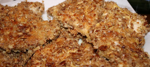 - Then press chicken into coconut/pecan mixture on both sides, set aside on plate.