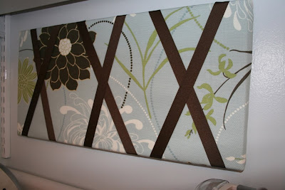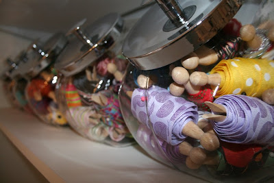 I purchased these glass jars at Bed, Bath, and Beyond and used them to organize my ribbon.  They bring in a tiny punch of color.
