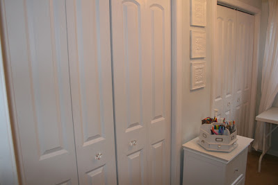 Previously, I had a curtain that hid shelves.  When I redecorated the office, I added a wall with double folding doors.  It looks much more organized and really finishes off the room (although I’m not showing what is behind them).