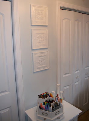 I love these tiles.  I purchased them at A Classy Flea, and I updated them with some glossy white spray paint.  Oh, and I moved my white file cabinet out from the closet to use as more counter space.