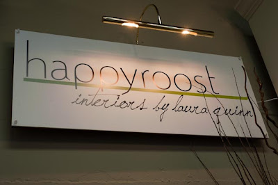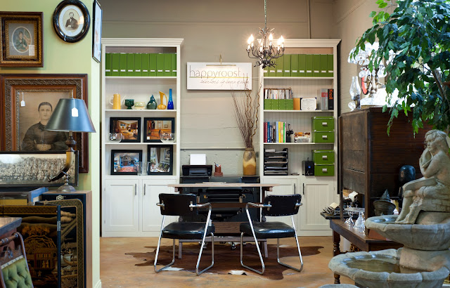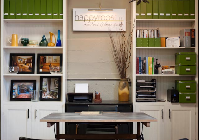 I’m an interior designer in Dayton, Ohio and just started my design business “Happyroost” in December of last year. I recently opened up a small studio space inside of an antique store in the Oregon Historical District just south of downtown. I wanted my studio to have lots of storage space and lots of different ways to organize samples of fabrics, flooring, paint chips, etc. I also wanted the space to reflect my own personal style as a way to advertise my design services for people coming into the store. I started with the large bookcases that I designed and my father and brother built for me (I’m so lucky to have them to help me!) They are 9′ tall so there’s plenty of shelf space and they certainly make the little area seem more impressive. My desk is a vintage drafting table I bought for cheap off of Craig’s List (gotta love Craig’s List!). The top was pretty rough when I bought it so I sanded it down and painted a kind of faux finish on top. The cowhide rug from Ikea adds to the rustic feel while the black and silver chairs and my contemporary office chair keep it more modern. The green magazine holders and boxes (also Ikea) provide great storage and color while keeping the shelves streamlined and clutter-free. I keep all my old design magazines at the top. They’re out of the way but I still have them to reference when I need to. Last but not least, is the wrought iron light fixture. I actually got this light for free from a friend! I love how it helps bring the high ceilings down to a more personal scale.