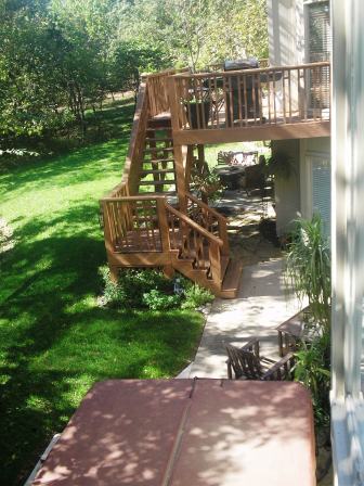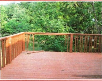 We repaired the railing, replaced the rotting boards, powerwashed, sanded and stained the deck.