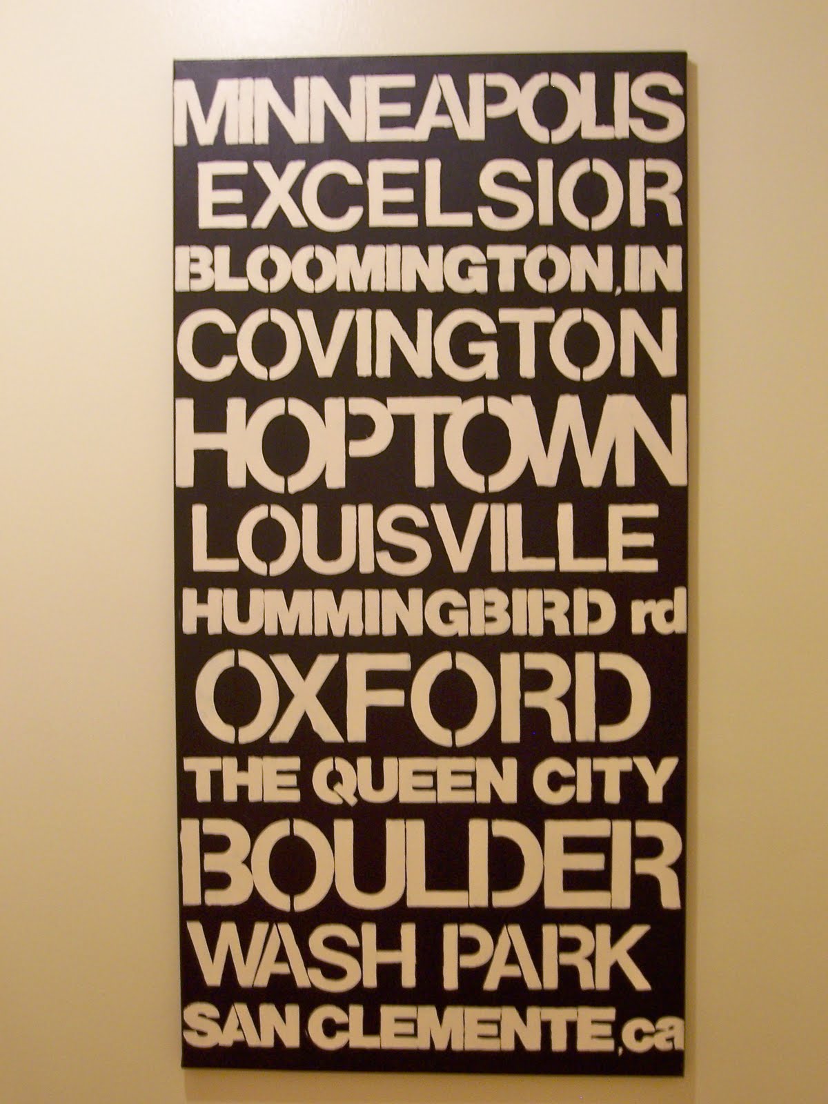 We created a list of every place Nick and I lived starting from birth until now. This is where you can get a little creative (i.e. instead of Cincinnati, we used the Queen City). This helps to switch it up. From there we taped together a paper “canvas” so we could see the spacing and make adjustments. This step is critical, I repeat critical.