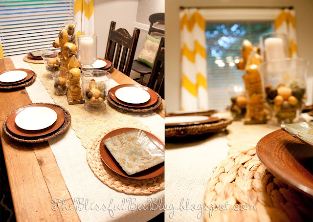 See how inviting this dining room is with updated lighting, a beautiful tablescape and yellow chevron painted drapes. Their dining room turned out to be a really nice upgraded space, with warm color combinations. The table setting looks really inviting. I also love what she did with here painted chevron curtains.
