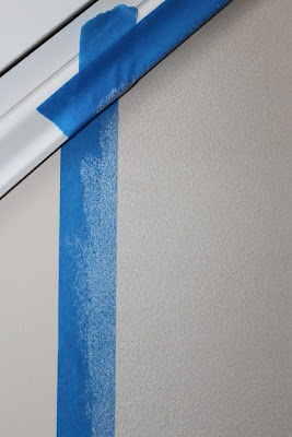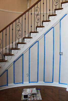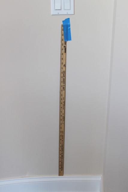 I didn’t really want that same look in this house, so I decided to use the same glaze in a striped pattern in this small area on the inside of my staircase. My colors there are silvery and mossy green. I am loving how it all turned out. It really didn’t take that much time either – I love a quick project with fast impact! Look below for the how to…First, I measured the wall length and decided how wide I wanted the stripes to be. I then took a small ruler and made tick marks across the wall – about 4 marks for each side of each stripe. I then took a yardstick placing along the tick marks to use as a guide for my painters tape. I did not draw lines down the wall with a pencil. The pencil will show through the glaze and not look very nice. I then taped the yardstick to the wall so that I had two hands to tape the stripes. I moved the yardstick up the stripe as I went along.