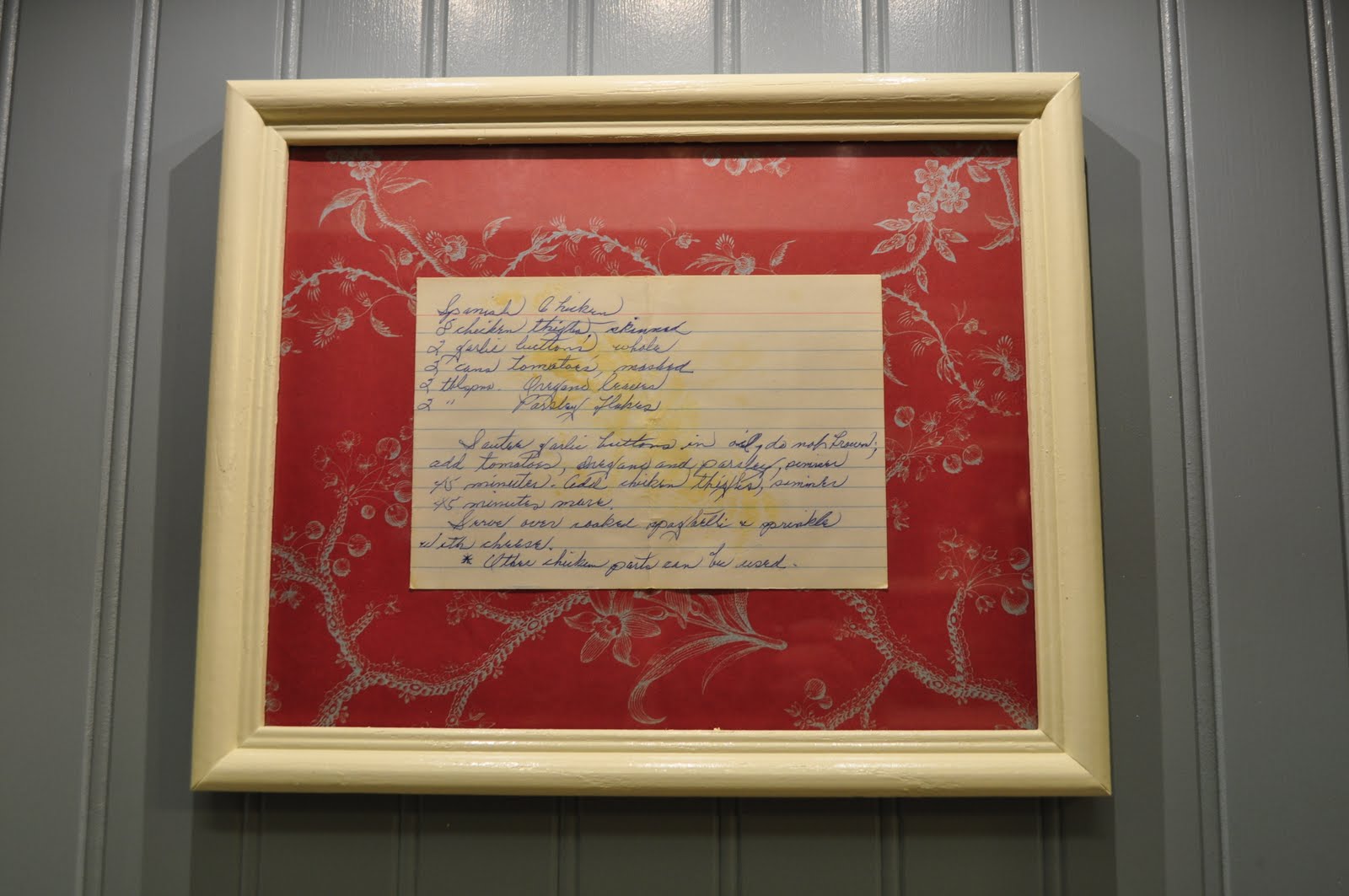Cha Cha over at Sit Relax and Read wanted to share how she displayed old recipes, and when I saw this I thought “What a great idea!”… I think it would be fun to see those treasured family recipes in your mother’s or grandmother’s handwriting, in fact I might have to get my dad to write out his favorites too! So fun!