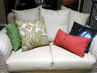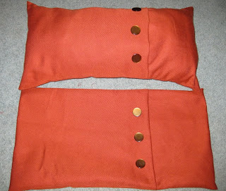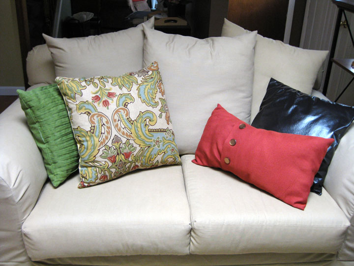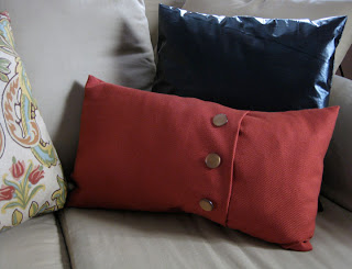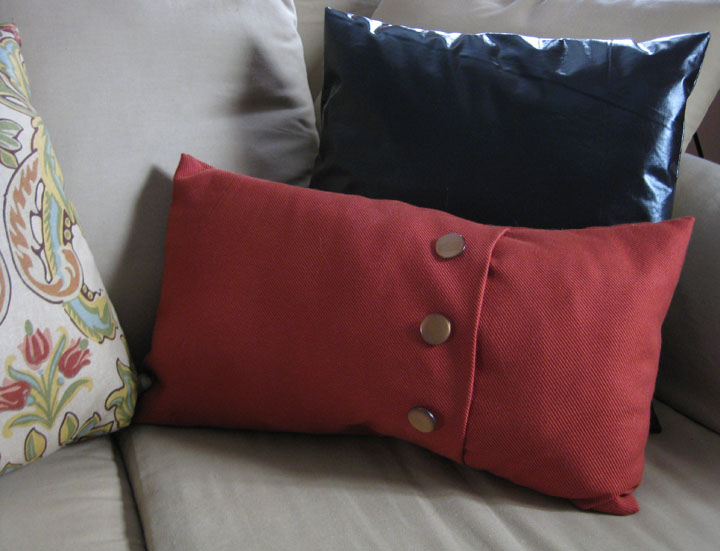 Back to the pillows… which are WAY easier to sew than slipcovers. By a landslide. I was inspired by some of these beautiful fold over pillows with buttons, from Pottery Barn. See the long rectangular red one? They are about $25 each for just the pillow cover (not including the actual pillow inside). I decided that I could probably make a couple of my own.