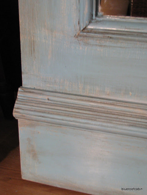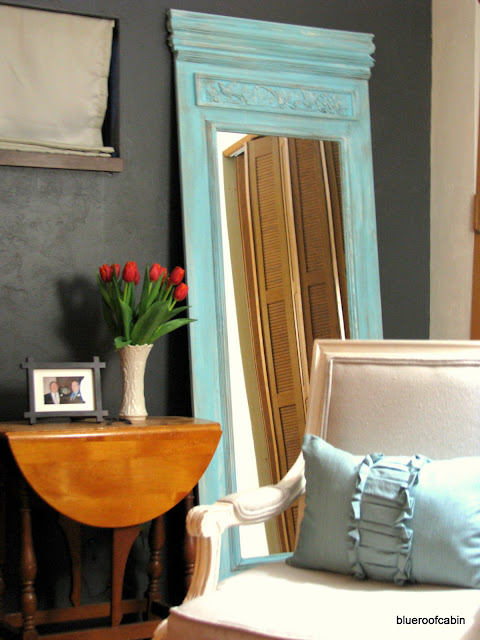 For the finish the color I used was Blue Ocean Breeze spray paint by Krylon.  After letting it dry for only about a half an hour (impatient much?) I dry brushed with off white paint and used dark brown glaze to finish.   This color is BRIGHT, the glazing really tones it down.  I used the same color on an end table that is across the room (shown here) and similar blues are in artwork and pillows in the room.