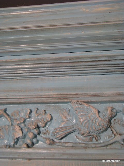 The carved piece along the top is something I got a million years ago but never quite figured out what to do with.  The design is grapevine and birds.  Don’t have one of those lying around? That’s okay Home Improvement stores sell all kinds of fancy moldings and scroll details. The possibilities are endless!