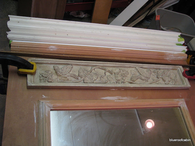 To hold the mirror in place I purchased molding that has a notch in it.    I laid the mirror on the plywood and started playing around with different trim. Two hours later I was still playing with it.  I finally had to tell myself just start cutting women or you will never get done!  It went pretty quick after that.  I used glue and my handy dandy nail gun to attach the trim being extra careful with the trim around the mirror.