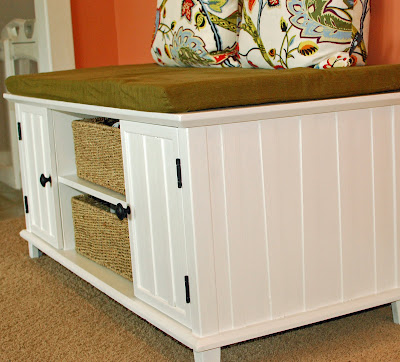 Throw in a couple of rattan baskets and two decorative pillows that match the throw pillows on the couch, and now I have an awesome bench and even better toy storage piece!
