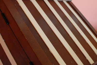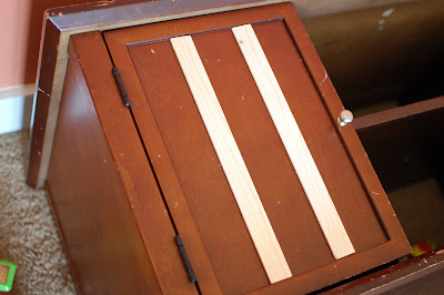 ..and sides of the entertainment center. I wanted to add a little bit of interest to the otherwise plain boring sides. Jason already had these thin pieces of wood left over from a previous project, so all I had to do was cut them to the correct length and glue them on.