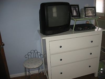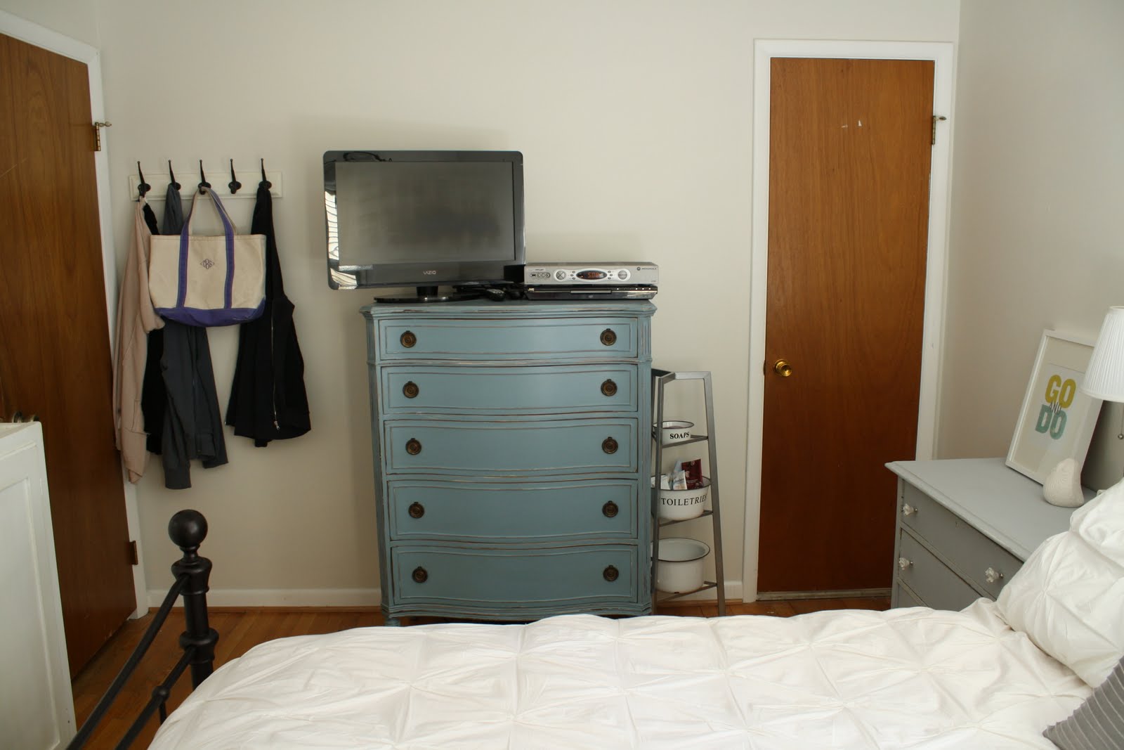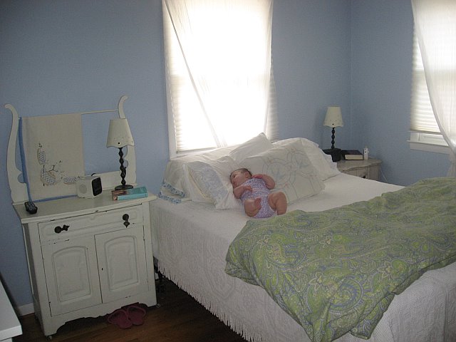 Chris and the kiddos are at the beach with Gram Pam and Uncle Trav so I have been left to my own demise. I have been working on a few projects, but the first I want to share is my master bedroom (if you can call a 12 x 11 space master?). I spent all Friday painting it, and I will say the benefit of a small room is that I was able to use one gallon of paint in the entire room! I chose a white called “Cloud Cover”. It’s Benjamin Moore Color, but I had my local Sherwin Williams match it since I could purchase their Harmony eco-friendly paint for much less mula. To make the impact of the new bedroom color, I thought I would take you on an embarrassing trip down memory lane, to what our bedroom looked like when we moved in. We had a bedframe, no head or footboard, 2 IKEA dressers and a blue and green duvet cover I had made. The blue on the wall was “Twilight” by Sherwin Williams. It wasn’t awful, but looking back, it sure wasn’t pretty.