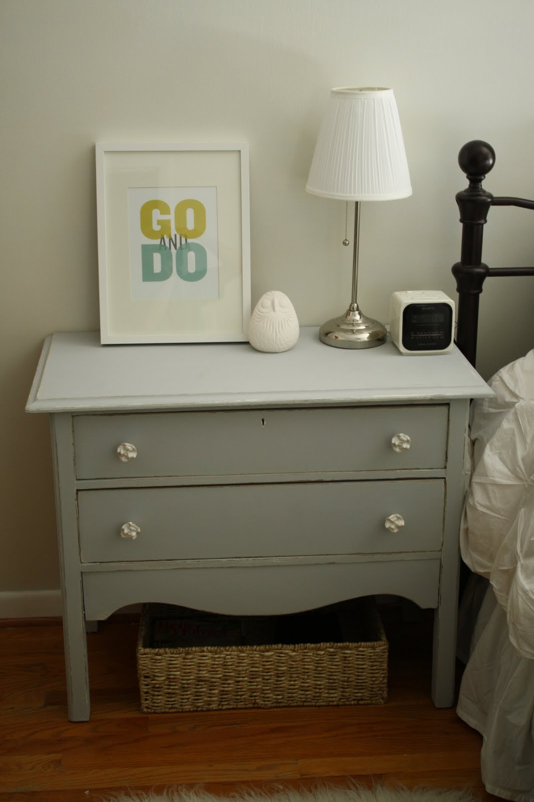We’ve been in this house for 3 years now, and in that time, I replaced the dressers with vintage dressers I painted. The white one is actually a child’s armoire, but it fit the space better as it is narrow. Meaning, we can actually walk along the foot of the bed now without turning our hips! Also, we’ve purchased an actual bed from Overstock.com, and we went through more bedding. Recently, I purchased a new duvet cover and was ready to really vamp up the room, repaint it and bring it up to date a bit more. Oh, and I won an awesome print from Kantan designs through a giveaway that Kirsten at 6th Street Design School. I love it! I purchased a frame from IKEA and put it on my nightstand! I am trying to decide what to hang above the nightstand and am open to suggestions, by the way! Anyway, here is what the room looks like now… Oh, and I know the doors need to be painted…. badly…. but I am putting it off big time!