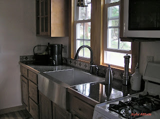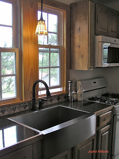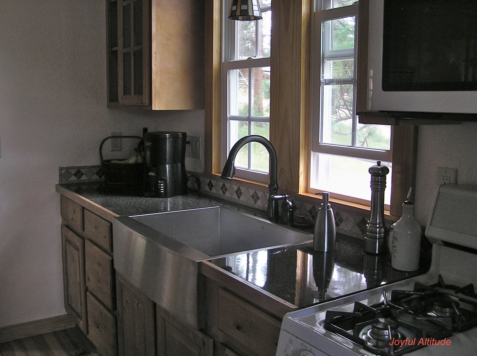 Since we didn’t have room for a dishwasher, I opted for a large sink. Dennis and I both like to do dishes, and with this sink it’s a pleasure. . .
