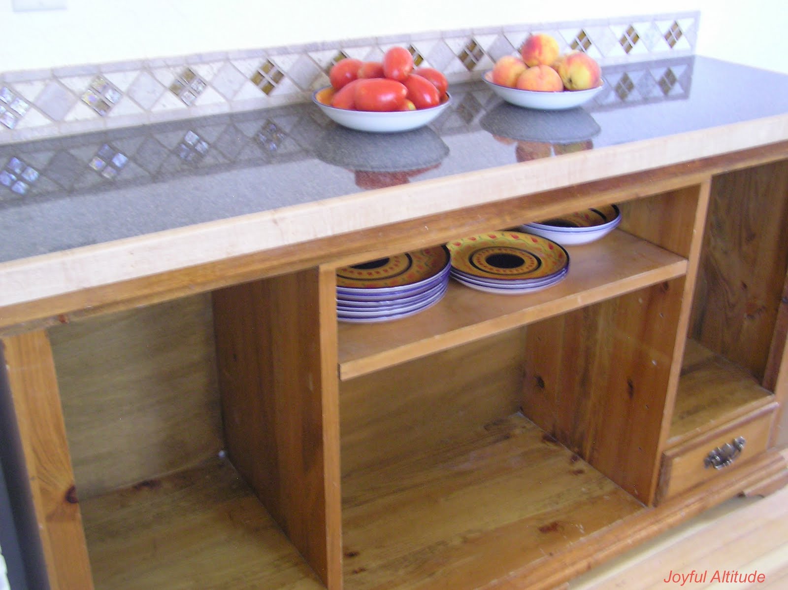 When you have a small home (624 sf), you have to make good use of all space. We got a great deal on showroom display cabinets from our cabinet guy, but we needed to slightly adjust them to fit our kitchen. He cut down a double door wall cabinet to create one cabinet, with shelves for my cookbooks . . .