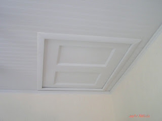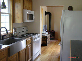 The new bead board ceiling, and the attic access panel — which Dennis made from an old door in the cabin — make the kitchen ceiling fun. . .