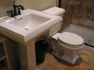 The bathroom is much more spacious now. We have 30″ to the left of the sink for storage. We’re using a small bookcase for storage until Dennis builds something for us. . .