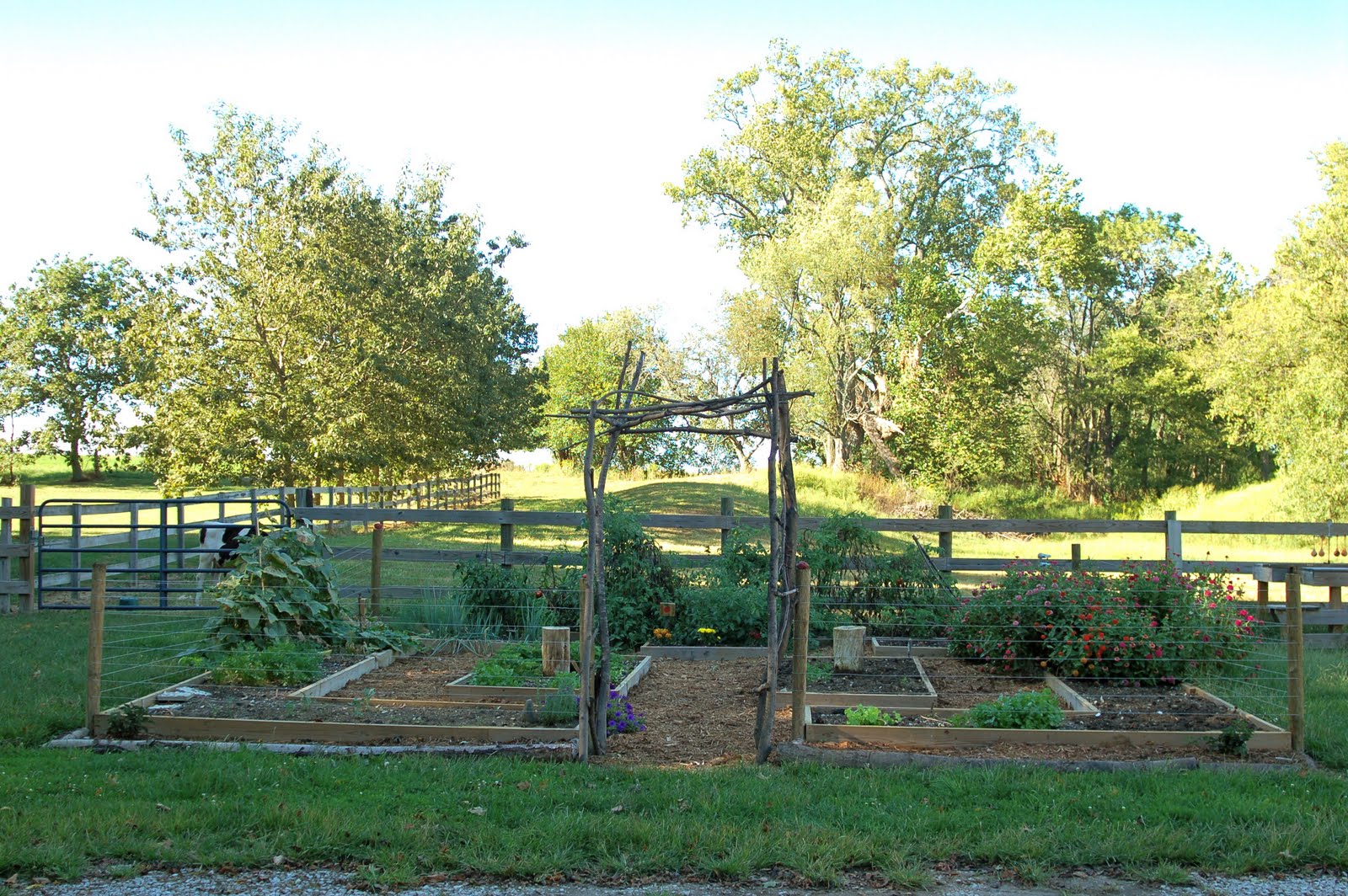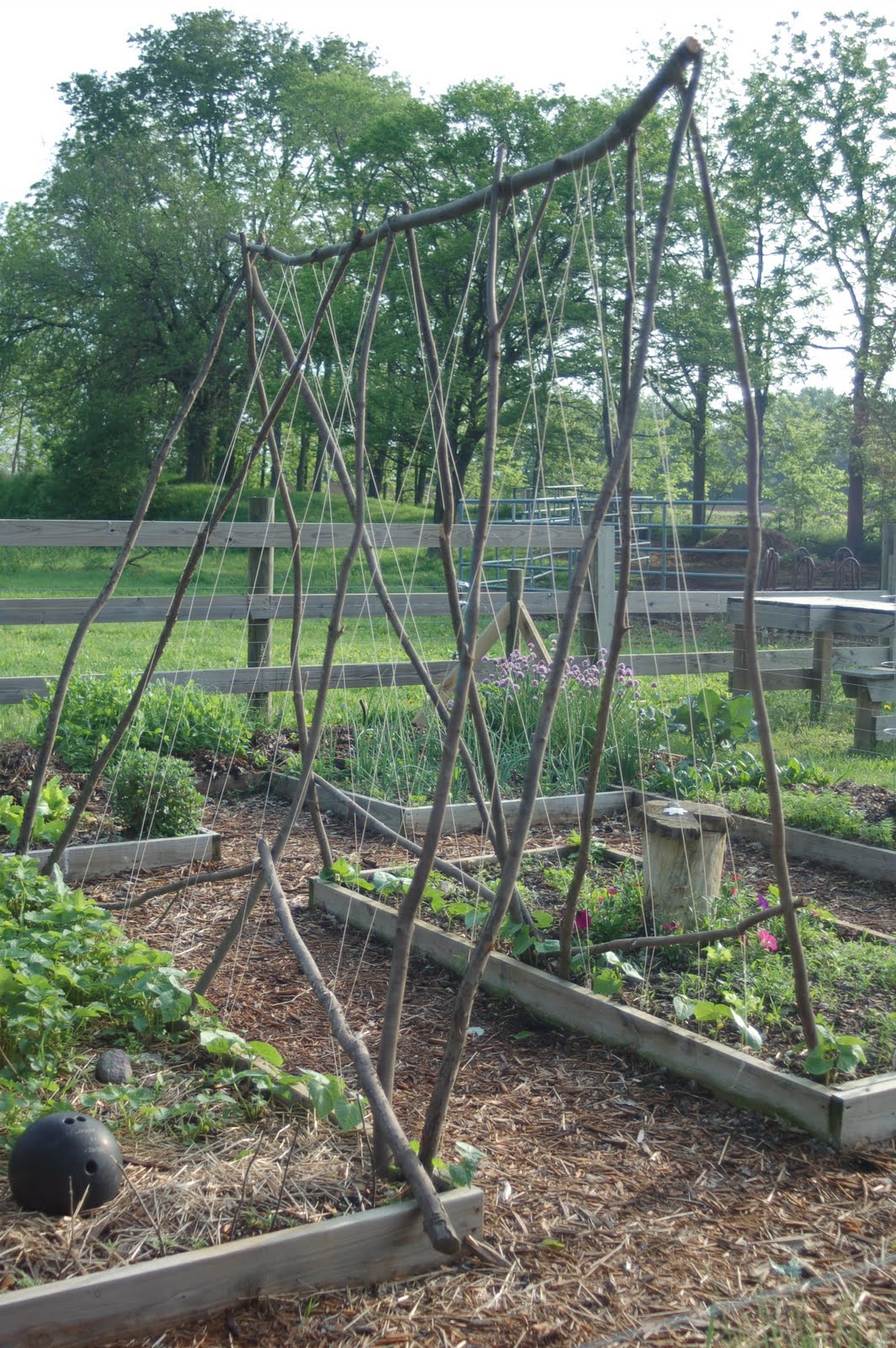Josh added the high tensile fence around the garden. It’s not to keep out animals – just to define the boards and give a visual stop to kids and dogs. But I didn’t want it to block the view. Plants can grow up it too. After a little training of dogs and kids this has actually worked well.