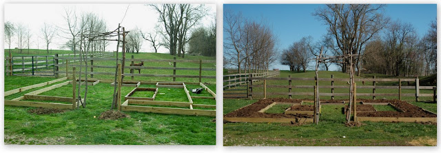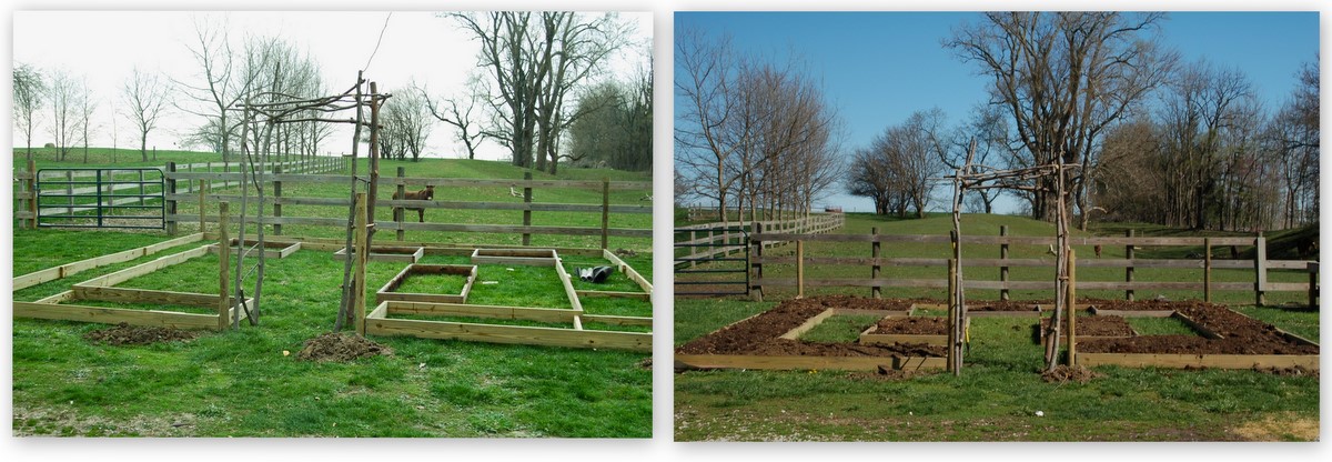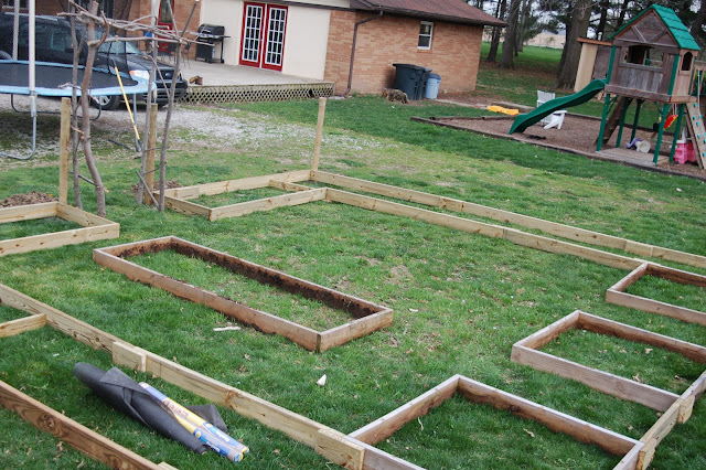 Then the frames for the beds got made. We moved the one 4/8 and three 4/4 beds we already had into the design. Josh braced the longer beds with shorter boards that would be hidden under dirt, but would keep the beds from bowing.