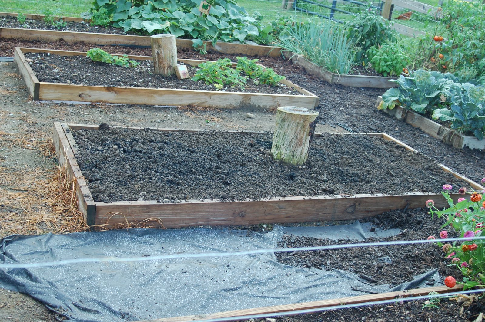 Once the frames were in we put weed mat in the beds and used the tractor to fill the beds. We knew to make them heaping full, because they would settle.