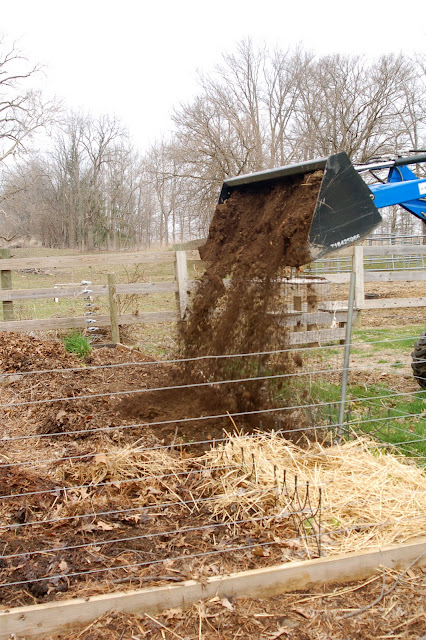 Then the spring rolled around and last years horse/goat/cow poop was this years compost. I raked off the layer of leaves and we added a few tractor scoops. Then the leaves went back on to block out the weeds.