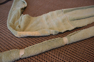Step 1. I measured the banister and cut the (now sewn/taped together) towel piece to length.