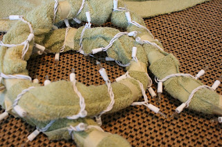 The inspiration for this idea is a window treatment my friend Kim did in her daughter’s room. The hard part was coming up with a bendable “bar” type string. That is where the towel came in. I cut some old towels into 1/3’s length wise. Then sewed them end to end, (although I realize now that I could have just masking taped them together for those of you without a sewing machine.)