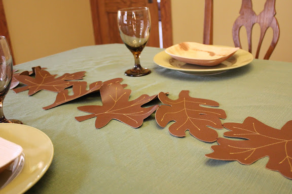 I found this really great faux leather at a warehouse this week. I bought a half a yard for $2. I had a million things in my head I wanted to do with it. But then it hit me, I really wanted to make a table runner of big leaves.