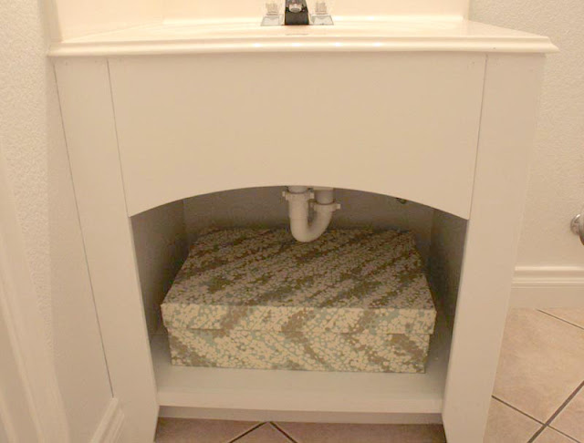 >I am not a fan of the exposed plumbing look, but I do like it! I think that the arch looks kind of plain though, maybe there is some sort of wood applique you could put there? Nothing too gaudy, and of course it would just be painted the same as the rest. Also, I think a basket would look cooler underneath than a box.