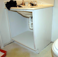In my quest for affordable remodeling, reusing things is a must. The bathroom vanity doors usually match the kitchen cabinets and can therefore be used elsewhere, like we have done before. My other train of thought is, that I am sick of the boring, stock vanity cabinets that are usually used in cookie cutter homes like mine.