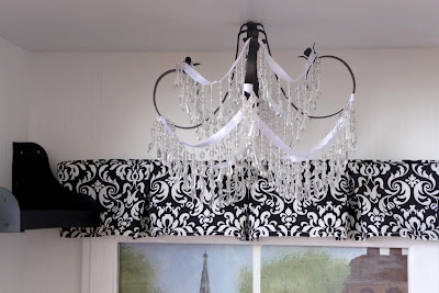 After several weeks mulling over design possibilities, I decided to do a Tres Chic French theme, with a pale pink, black and white, a faux chandelier and damask curtains over the window with the view of the Eiffel Tower. I have to say, I am tickled pink with the results: