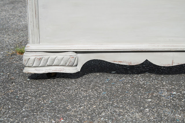 In the past, I have always distressed Annie Sloan Chalk Paint ®by hand with sandpaper, sometimes before waxing and sometimes after- both ways have worked for me. This time, I decided to try the wet rag method. I simply took a rag and wet it, rung it out so it was damp, and rubbed it along all the surfaces I wanted to remove paint from. It worked beautifully and did not create the dust sanding creates, but sometimes did not distress as easily. In that case, I would take a piece of sandpaper to my dampened area, and the paint came right off. So the combination of a wet rag with a little bit of sandpaper seemed to work really well for me.