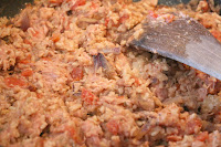 Heat skillet over medium heat. Add olive oil, onion and garlic. Remove from heat and add the tomatoes, meat, rice and oregano, mix well and stuff inside of peppers.