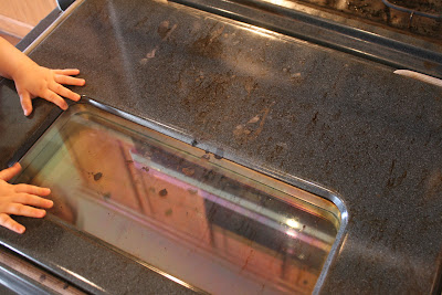 The next project to tackle that is often severely neglected or just plain ignored… the inside of my oven, I had a little helper, there at my side the. whole. time. So it, was good I was not using something really toxic. For this project I used the scour off again and basic H2 for an overall wipe down when I was done.