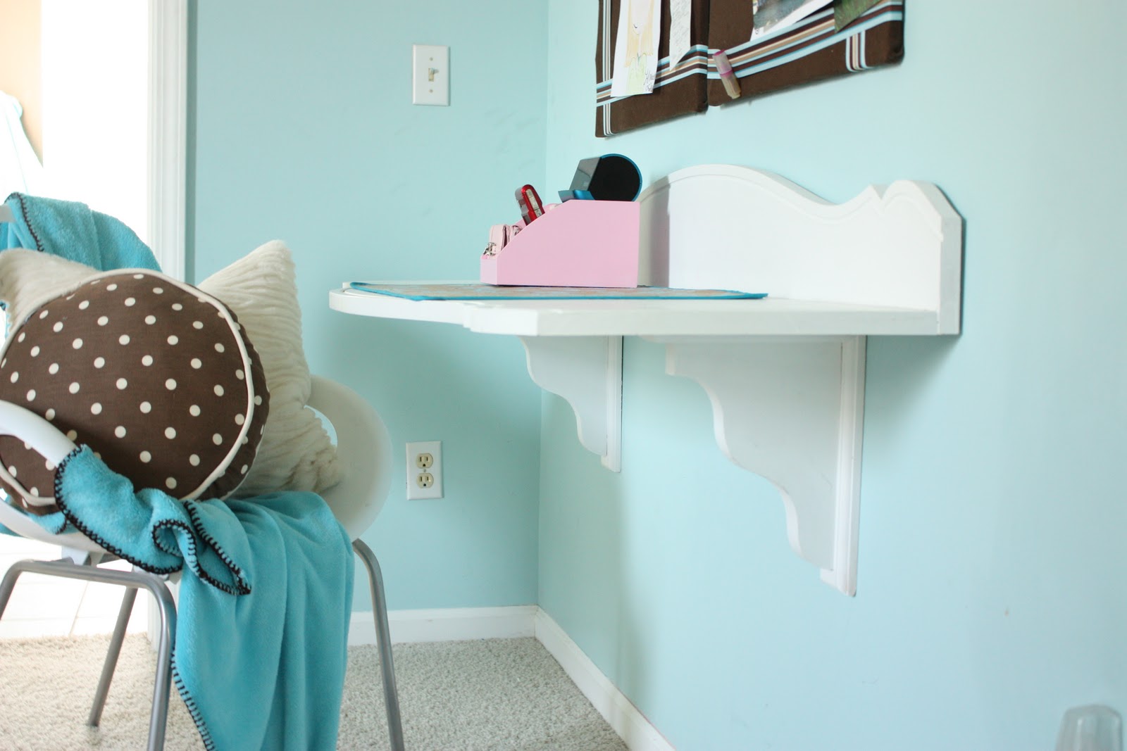 I picked up two large wood brackets from Home Depot and screwed them to the bottom of the desk. We mounted the brackets to the wall and into the studs.