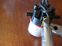 Next step was the lighting portion of it. If you look at the PB light, there isn’t a cord going through the glass — it simply gets pushed out the top. So I used the wires and switch from this light: