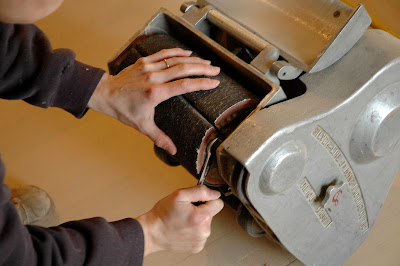 With the belt sander UNPLUGGED, insert your first piece of sandpaper. Since there are so many different kinds of sanders, ask the rental company how to put the sand paper in. Or, you can email me and I can show you how with this particular model.