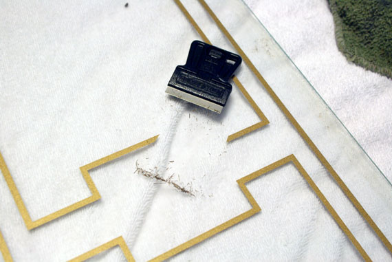 Okay now, this is an important little tip, if you have ugly painted junk on your windows it comes off… like buttah, with just a little razor blade, no chemicals required! See below: