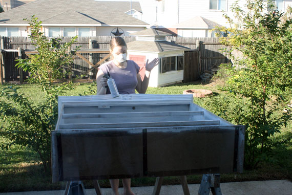 When I realized that thick globby paint (that we returned immediately) wasn’t going to work I turned to spray paint. I really need to invest in a spray gun (but since our compressor was stolen) it wouldn’t do me much good now… and I just can’t swallow the $200 price tag right now… UGH! Luckily our awesome neighbor Santiago has let us borrow his!