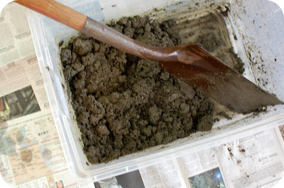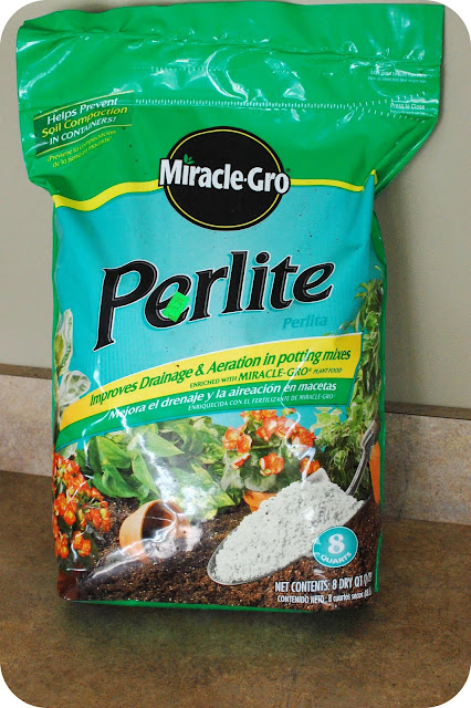 Mix together equal parts perlite, peat moss and portland cement in a large container. The amount you use of each does not matter as long as they are equal parts. I used 2 quarts of each. A wheelbarrow would be great to use for mixing, but I don’t have one so I used an old rubbermaid container.