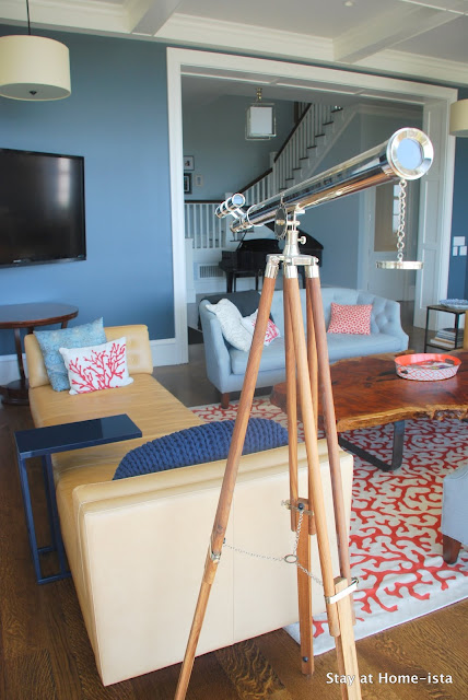We added the telescope to break up the horizon in the room. Our kids also like to stand on the settee and look for San Francisco. Or Papa’s house. My dad lives across the bay, and in theory, if there is no fog, we could see him.