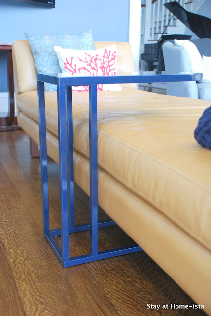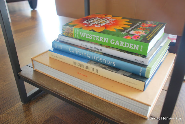 The side tables are from Overstock, and I added a navy and white greek key tray from Z Gallerie and a collection of architecture books underneath. And the gardening book I need if I ever want anything to grow on our deck.