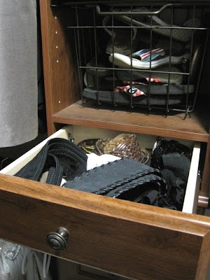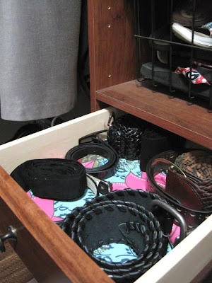 I liked the way this looked so much, I lined two more small drawers which Scott and I both use (on our respective sides of the closet) for belt storage.