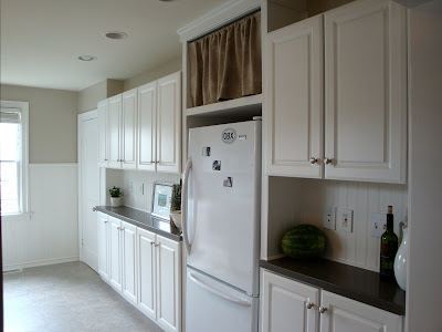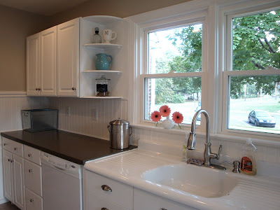 Really cute redo! Love beadboard ! I must know the logo on that one piece kitchen sink! Love it!