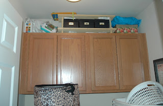 Here is the before pictures. When we had our cookie cutter house built, we had them install cabinets in the laundry room, but went with the basic, simple, oak cabinets that are in every other house. One of the things on my to do list, is to change all the cabinets, but instead of buying new ones (that is SOO not in the budget), I want to redo them all. So, I started with the Laundry room. And I LOVE the outcome. First of all, the room is SMALL, basically only room for the washer and dryer. And it felt as small as it looked. And we were using every nook and cranny for storage in that room. It was really starting to bug me having the clutter up on top of the cabinets showing. So I used a tentsion rod, and some fabric out of my craft room to hide the junk up top. The fabric is actually a clearance shower curtain I found at Ross awhile ago for like$1.99 or something crazy like that. I also made a curtain to go on my folding table that used to be a bookshelf, to contain more items being stored in there. And I Love the bright color it adds. I have always been a fan of the color yellow. It is such a happy color, and when you are folding laundry, you need to have some happy reminders. I used some leftover blue paint from one of my friends projects (thanks Jess!), so that was free. The bookshelf turned folding table was given to me by my sister in law, so that was also free. The paint was used for another project, so you can say that was free to! I did have to purchase The soap jar (goodwill for $5), the polyurethane ($9) and the deglosser ($6). (More on painting cabinets soon) So the grand total for the makeover was around $22. Not bad, I think. And the room feels soo much bigger, and put to better use.