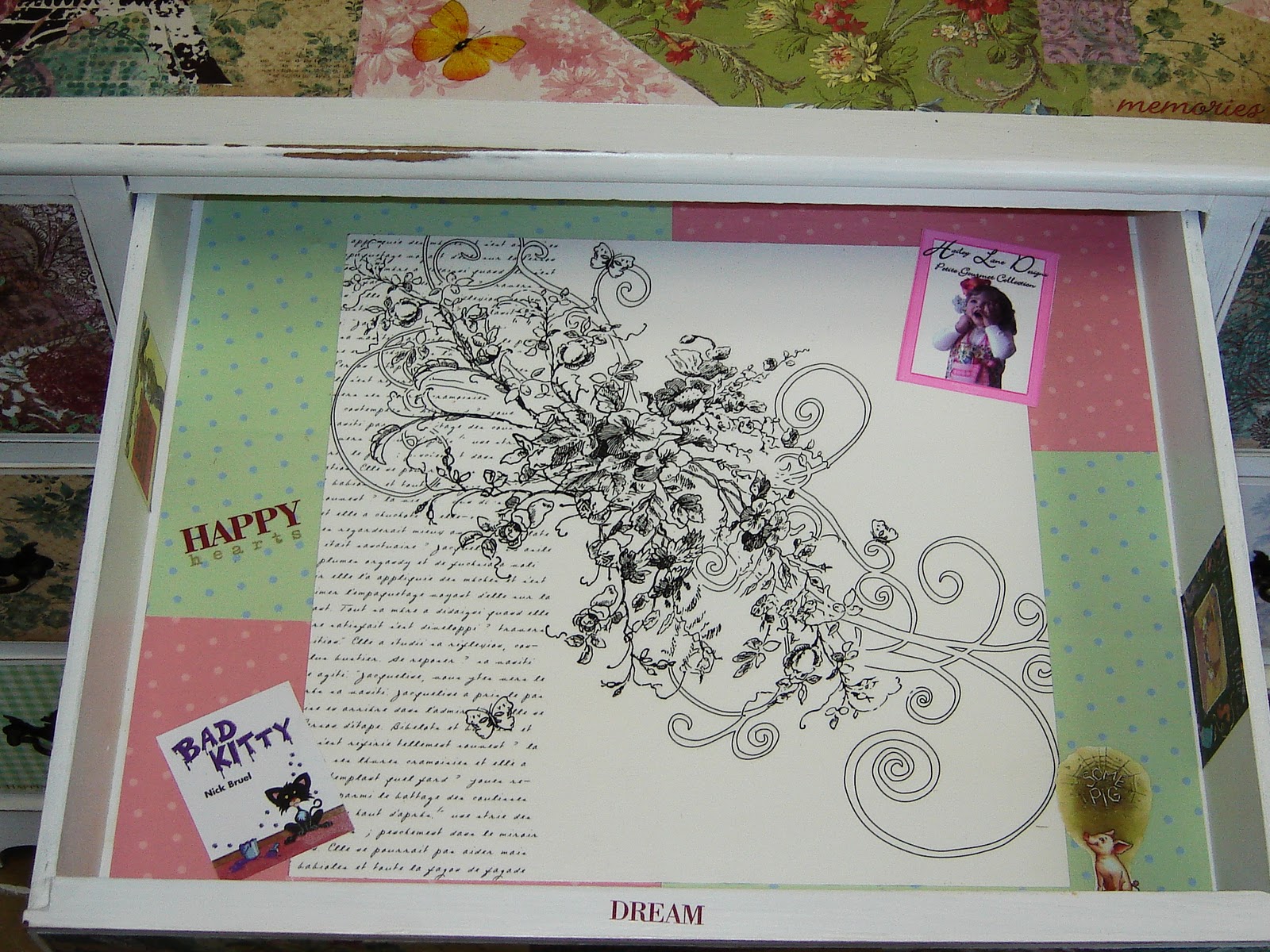 The inside of each draw is also papered and decorated with tiny book covers of my daughter’s favorite books, my business card, old photos of her and sweet messages. I used rub-ons here and there for little hugs of inspiration when she opens the drawers. Rub-ons are very addictive, I had to stop myself from going over board!