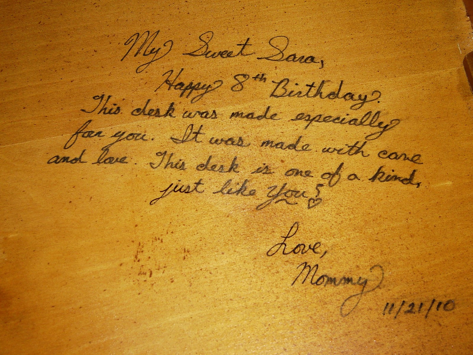 A few secret messages on the under-side of the middle drawer, complete with her own set of