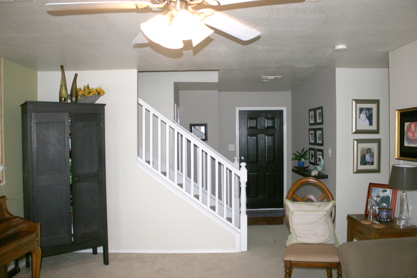 Next, was a simple change. We removed one of the round back chairs. Moved the other to a new location. Added the computer armoire to the corner, near the piano, since this was the only place it would really fit.