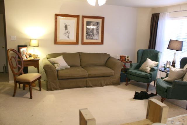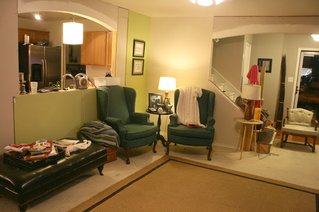 We put the wing backs in the corner… but they felt too big. The armoire was HUGE on that wall, and blocked my thought process too much. At this point we also found some five dollar Craig’s list chairs ( love can’t wait to finish re-doing) that we put in front of the window, but it was just awkward.